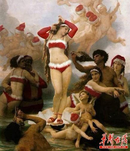 名畫《維納斯的誕生》也慘遭惡搞,這幅來自15世紀(jì)后半葉,佛羅倫薩畫派、藝術(shù)大師波提切利創(chuàng)作的畫作也未能幸免。原畫中優(yōu)美動(dòng)人、線條婀娜的維也納“一秒之內(nèi)變舞娘”。變裝后的維納斯穿上了紅白搭配的內(nèi)衣,腳上也穿著紅色的高跟鞋,瞬間變?yōu)橐粋€(gè)夜店舞娘的形象,還嫵媚地?fù)崦约旱拈L(zhǎng)發(fā),身后的人群也穿戴得如同在慶祝圣誕節(jié)。