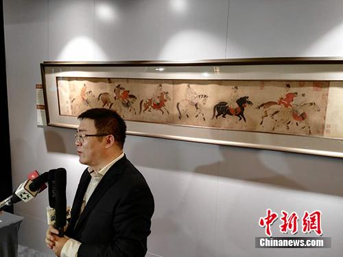 ????保利拍賣執(zhí)行董事趙旭在《五王醉歸圖卷》前接受采訪。中新網(wǎng)記者 宋宇晟 攝