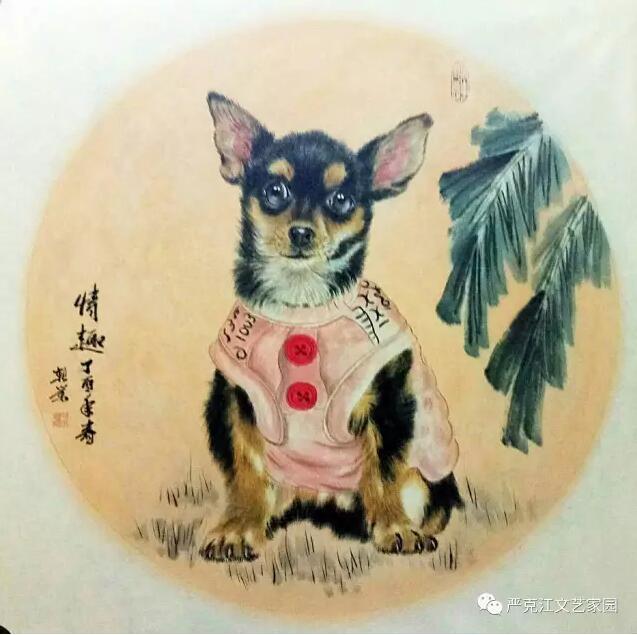 犬是最通人性的動(dòng)物,亦是人類患難與共的朋友,它對(duì)人類特別忠誠(chéng),因而具有忠貞不渝的意義?!澳裂蛉Ю飳ぶ鳌?,“義犬救主”等例子很好地說明了這一點(diǎn)。常言道“貓來窮,狗來富?!彼匀嘤型?cái)?shù)脑⒁猓白怨拍撩裣Т巳?,饑腸食雪不離羊?!边@也是對(duì)犬忠誠(chéng)的真實(shí)寫照。也是民間藝術(shù)喻意象征的特色。“犬盼人歸迎陌上,搖頭擺尾蹭懷中。”把犬對(duì)主人的那份情感和依賴,描寫的淋漓盡致。