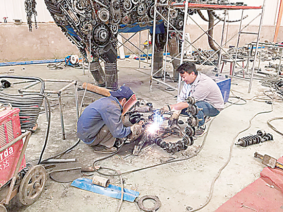 設(shè)計(jì)者田國鑫畢業(yè)于西北民族大學(xué)藝術(shù)設(shè)計(jì)系,現(xiàn)擔(dān)任該公司鐵藝車間經(jīng)理。作為一名90后的男生,他從小就是看著《變形金剛》長大的,他獨(dú)愛鐵藝設(shè)計(jì),對那些大黃蜂、擎天柱等角色有著很深的感情,他有他獨(dú)特的設(shè)計(jì)風(fēng)格和創(chuàng)作手法。在他眼睛里,我們身邊并沒有任何所謂的廢棄物,有的只是面對廢棄物所短缺的設(shè)計(jì)靈感。田國鑫告訴記者,經(jīng)過一段時(shí)間摸索,目前園區(qū)制作出的鐵藝產(chǎn)品種類豐富,形態(tài)各異,制作一個(gè)大型鐵藝術(shù)產(chǎn)品,兩個(gè)人只需要半月時(shí)間便可完成。