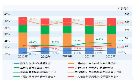 工程教育不斷調(diào)整課程模塊,呈現(xiàn)工科特色,人文社會科學(xué)類通識課程模塊受到重視,課程設(shè)置更關(guān)注對學(xué)生通用能力的培養(yǎng),工程實踐與畢業(yè)設(shè)計模塊學(xué)分及占比有所上升,畢業(yè)設(shè)計(論文)更加體現(xiàn)工程性,反映專業(yè)更加注重對學(xué)生工程實踐能力的培養(yǎng)。