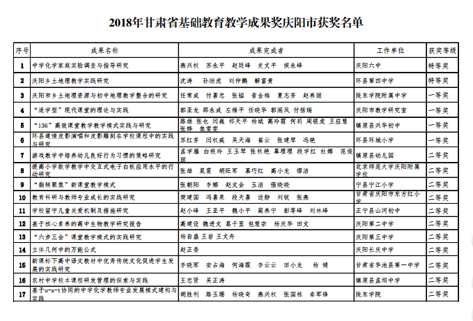 ????2018年8月7日,甘肅省人力資源和社會保障廳、甘肅省教育廳以甘人社廳發(fā)(2018)32號文件,公布了2018年甘肅省基礎(chǔ)教育教學(xué)成果獎評獎結(jié)果。我市17項成果獲獎,其中特等獎2項,一等獎4項,二等獎11項。這是我市在歷次省級教學(xué)成果評獎中獲獎最多的一次。