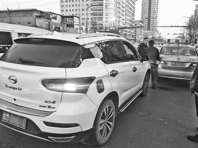 西峰區(qū)秦霸嶺路口,私家車和出租車發(fā)生事故后,兩名司機(jī)發(fā)生矛盾。本報(bào)記者 鄭朝靜 攝