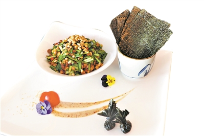 這道菜的制作方法非常簡單,在家也可以做。先把新鮮韭菜切斷,香菇、馬蹄切成粒狀,河蝦剝殼,肥瘦均勻的叉燒切粒備用。接著起鍋,將河蝦與叉燒一起翻炒,爆出香味,放入韭菜、香菇和馬蹄粒,一起炒。上盤后撒上松果仁,滿盤清香。最后拿一片鹽烤紫菜,包上餡料,放入口中,鮮香爽口,層次感豐富,鮮美異常。
