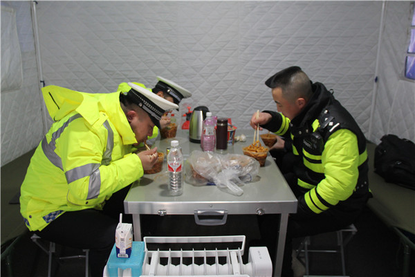 楊文杰和同事們在工作間隙簡單解決午餐 本報(bào)記者 鄭朝靜 攝