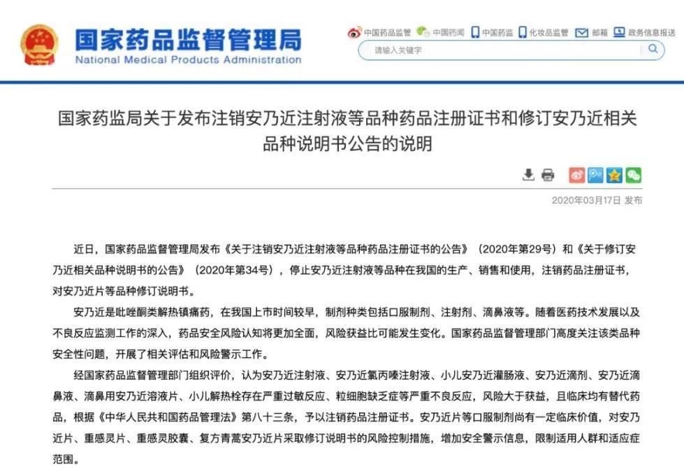 此次公告同時,國家藥監(jiān)局又發(fā)布了一份注銷安乃近注射液等品種藥品注冊證書的公告: