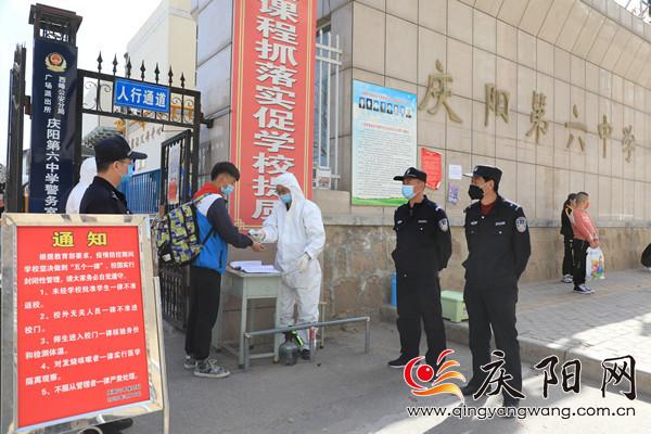 ?慶陽六中學(xué)生進(jìn)校前接受體溫檢測(cè)。記者黃飛 攝