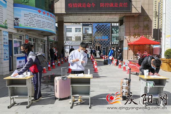 慶陽二中高三級(jí)返校學(xué)生在登記出入信息、消毒。見習(xí)記者俄少飛 攝