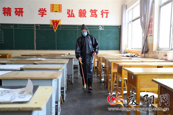 慶陽四中中午放學(xué)后,工作人員給教室消毒。記者陳飛 攝