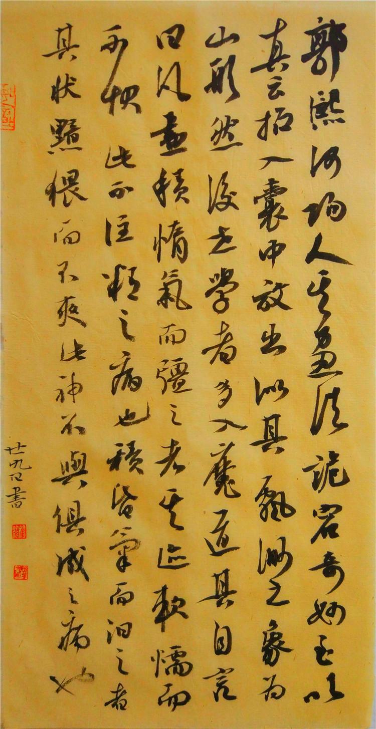 課余時(shí)間,當(dāng)同學(xué)們?cè)谕饷婊顒?dòng),我便一個(gè)人琢磨寫(xiě)字。每有閑暇,我總會(huì)翻開(kāi)字帖拿出筆墨書(shū)寫(xiě)幾筆,漸漸和書(shū)法結(jié)下了情緣。慢慢的我的字就變得端正美觀,常受到老師的表?yè)P(yáng)。學(xué)校每有書(shū)寫(xiě)活動(dòng),老師都讓我擔(dān)任主力,辦黑板報(bào)、寫(xiě)標(biāo)語(yǔ)等事情更不在話下。每逢新年,我總要寫(xiě)許多對(duì)聯(lián),除了家里用還要送給左鄰右舍。大家都稱贊我的字寫(xiě)的好,我心里美滋滋的。初中畢業(yè)那年暑假,我在家里臨帖寫(xiě)了一個(gè)多月毛筆字,書(shū)法寫(xiě)作有了很大的進(jìn)步,那時(shí)候雖然用功練習(xí),但是都是自學(xué),沒(méi)有老師的指點(diǎn),對(duì)書(shū)法沒(méi)有一個(gè)全面的認(rèn)識(shí),也沒(méi)有系統(tǒng)的學(xué)習(xí)。上高中時(shí),功課學(xué)習(xí)比較緊張,練字的時(shí)間自然少了,偶有時(shí)間拿起筆,竟感覺(jué)生疏不知從何落筆。后來(lái)上了大學(xué),學(xué)校開(kāi)設(shè)書(shū)法選修課,我這選修課一上就是四年。其間,我先后臨習(xí)《九成宮醴泉銘》、《張玄墓志》、《張遷碑》等碑帖,書(shū)法寫(xiě)作水平和書(shū)法理論素質(zhì)不斷提升。