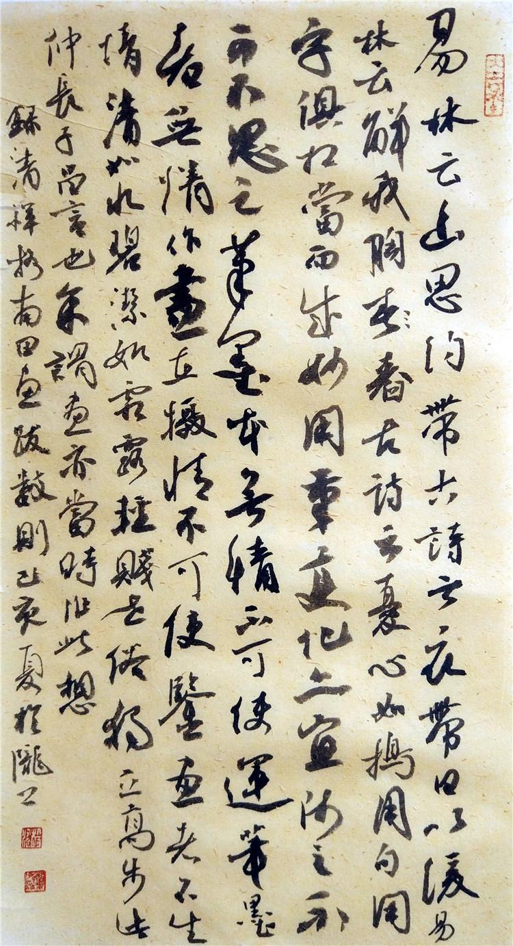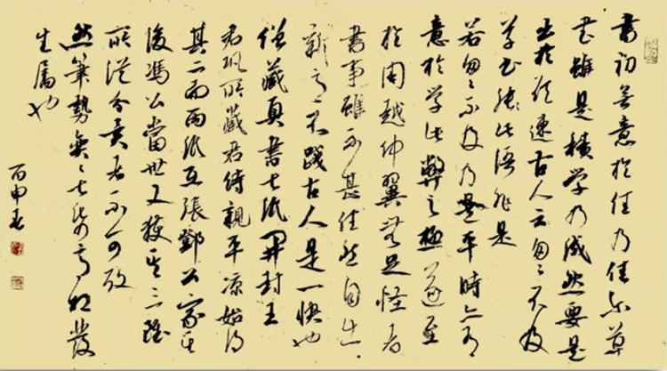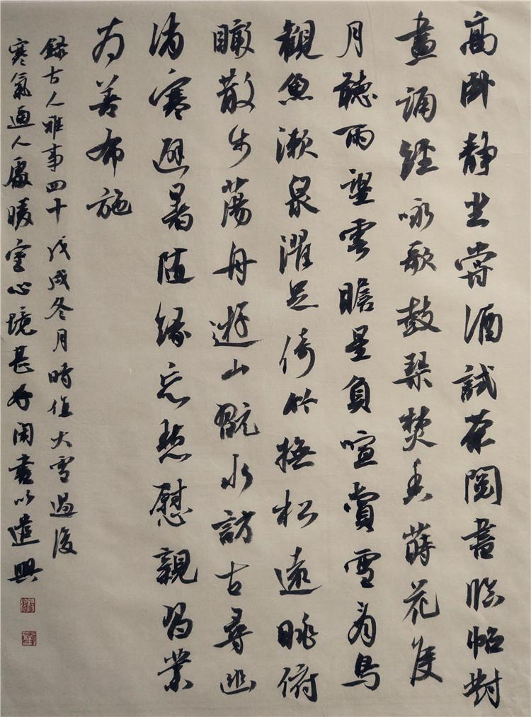 為了進(jìn)一步提高書(shū)藝,楊濤2017年進(jìn)入中書(shū)協(xié)培訓(xùn)中心導(dǎo)師工作室學(xué)習(xí),師從著名書(shū)法家王金泉先生。王先生在認(rèn)真審視其作品后,建議他再學(xué)習(xí)顏真卿的《祭侄文稿》和《爭(zhēng)座位帖》,以增加其作品厚重、渾樸、大氣。經(jīng)過(guò)一年的學(xué)習(xí),不論是小行草,還是大字作品,都呈現(xiàn)出樸茂、厚重、蒼茫的氣勢(shì),更接近他為人之風(fēng)格——拙訥、樸實(shí)、敦厚。古人云“書(shū)乃心畫(huà)”,從古至今,在一定程度上書(shū)法作品往往呈現(xiàn)著一個(gè)人的精神氣質(zhì)。顏真卿的書(shū)法也是在繼承王字的基礎(chǔ)上形成自己的風(fēng)格,體現(xiàn)了他正大、剛烈、厚重的人格魅力。以楊濤的勤奮好學(xué),我們有理由相信,楊濤在手摹心追繼承前人書(shū)法藝術(shù)的基礎(chǔ)上一定會(huì)找到并形成自己的書(shū)藝風(fēng)格。從目前來(lái)看,他的書(shū)法作品中既有王體的結(jié)體,又有顏書(shū)的筆墨,既秀勁又渾厚,既瀟灑又樸拙,既中和朗潤(rùn)又蒼茫正大。在扎實(shí)臨習(xí)書(shū)貼的同時(shí),再加上大學(xué)中文的功底,楊濤的書(shū)法道路一定會(huì)越走越寬廣,在古老的書(shū)法大樹(shù)上一定會(huì)綻放出新的枝條。