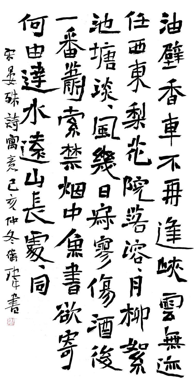衛(wèi)瑋的楷書以魏碑為主,多取法《元騰墓志》、《元略墓志》等。另外,他對(duì)碑刻、造像、摩崖均有涉獵,這些工作豐富了楷書書寫中的用字以及情趣。他的小字作品以墓志為主,用遒勁的線條,表現(xiàn)出一派清雅之風(fēng)。他的大字作品把碑刻、造像、摩崖結(jié)為一體,將碑刻的嚴(yán)謹(jǐn)端莊、造像的方雄質(zhì)樸、摩崖的渾穆奔放融合得妥妥帖帖,短長合度,同時(shí)又不乏通脫靈秀。他的行草書多擬二王,小字作品空靈典雅,流動(dòng)著秀麗的書卷氣。大字作品沉澀樸實(shí),大氣中展現(xiàn)著生動(dòng)磅礴。