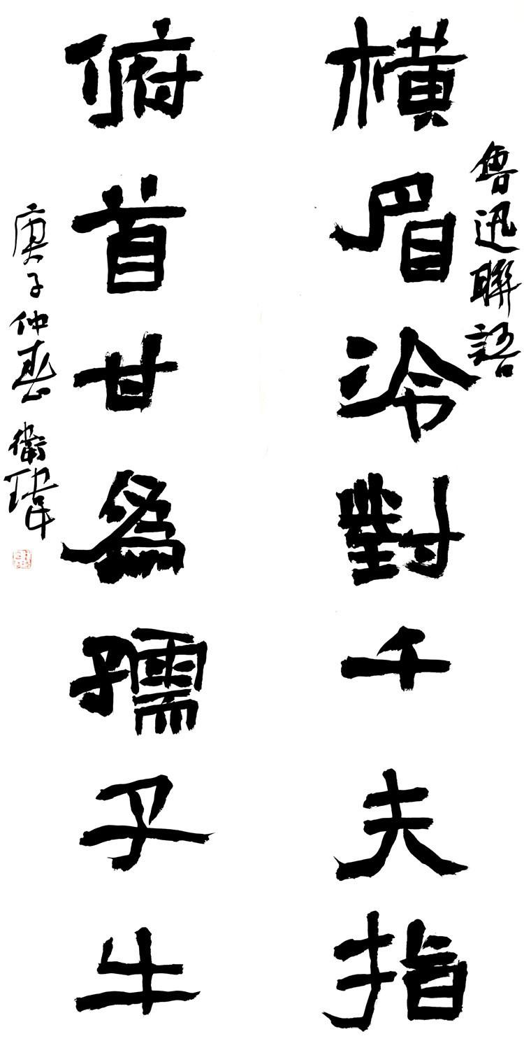 衛(wèi)瑋的書法以碑立骨立體,偶爾會(huì)用一些帖的內(nèi)容來調(diào)和。他的書法強(qiáng)調(diào)用筆的沉厚,力量集中,線條多以圓為主,行筆不尚雕琢,隨機(jī)應(yīng)變,八面出鋒。他的隸書作品主要取法《西狹頌》、《好大王碑》方整樸厚一路,同時(shí)他又很好地閱讀和借鑒了清代的隸書書寫。在不懈地摸索和實(shí)踐中,衛(wèi)瑋突出了漢代方整隸書蒼渾古厚的線條質(zhì)感和它們富于變化的造型特點(diǎn)。在清人筆墨格局的參照下,他的隸書逐漸形成了方整中寓雄渾,雄渾中流露靜穆,靜穆中又不失靈動(dòng)的審美趨向。談到他的隸書,何應(yīng)輝先生說道:“以其全國第二屆隸書展之獲獎(jiǎng)作品觀之,非拘泥古代一碑一石,拙厚而不乏機(jī)變,俊整而妙兼活脫。用筆方圓交互,善于在輕重起伏間表現(xiàn)活潑的情致。尤其值得肯定的是,在篇章的統(tǒng)一之中,字與字、行列與行列之間勢(shì)態(tài)的變化而又呼應(yīng)關(guān)聯(lián),表現(xiàn)出作者把握有機(jī)整體關(guān)系的藝術(shù)自覺,以此正迥別于當(dāng)下隸書創(chuàng)作之一大時(shí)弊。”
