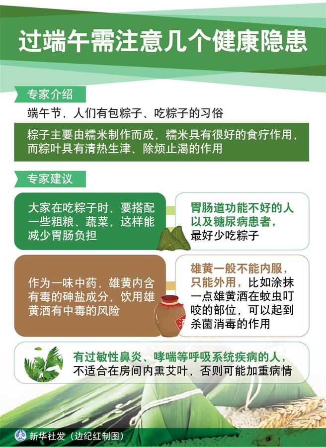 需要注意的是,有人喜歡把粽子當零食、甜點食用,這是不對的。唐細良建議,大家在吃粽子時要搭配一些粗糧、蔬菜,這樣能減少胃腸負擔。胃腸道功能不好的人以及糖尿病患者,最好少吃粽子。