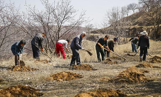 圖為西峰區(qū)彭原鎮(zhèn)草灘村群眾在荒山上挖坑準備栽植油松。記者 李卿 攝