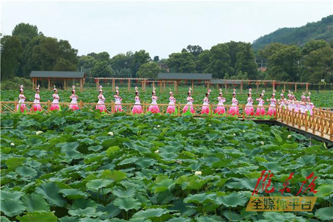 寧縣盤克鎮(zhèn)白吉湖百畝荷塘池邊一群舞蹈愛好者表演荷花舞(2020年9月1日攝)。特約攝影?李建琪?攝? ??