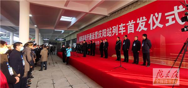 ????省政協(xié)副主席、市委書記贠建民宣布銀西高鐵慶陽站始發(fā)列車發(fā)車。中鐵蘭州局集團公司副總經(jīng)理孟慶宏,銀西鐵路公司副總經(jīng)理劉仲仁,市委副書記、市長盧小亨出席首發(fā)儀式并致辭。市委常委、常務(wù)副市長焦石主持首發(fā)儀式。