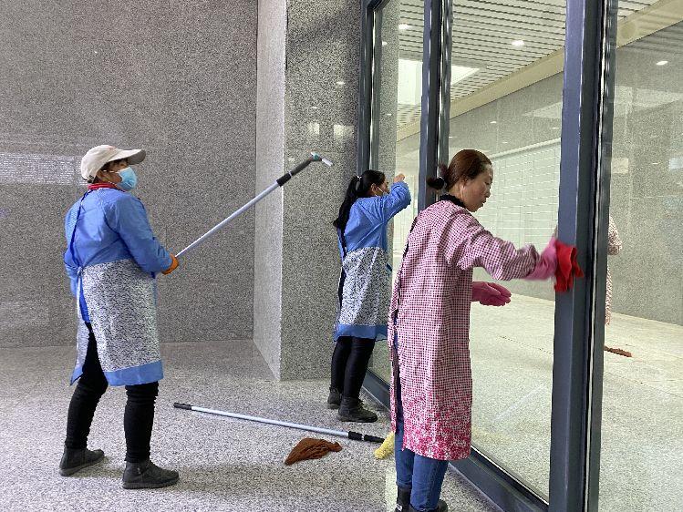 柴云云(右一)正忙著做保潔工作。見(jiàn)習(xí)記者米靜攝。