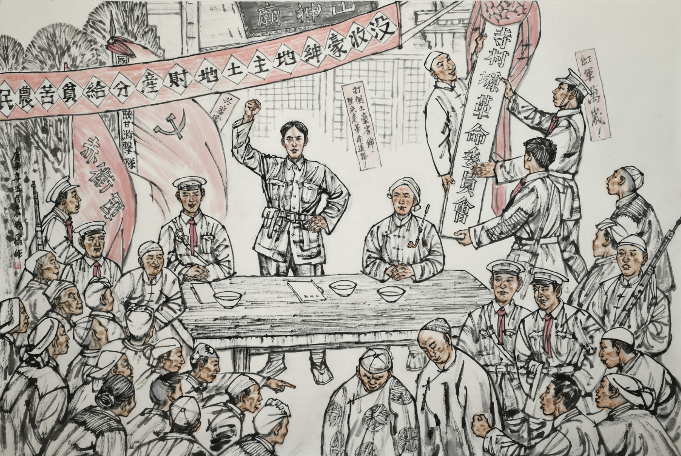 之后,游擊隊又在各村組織成立農(nóng)民聯(lián)合會、少先隊等組織。村設(shè)村會長,貧農(nóng)團設(shè)團長,赤衛(wèi)隊設(shè)隊長,各路團總改為各路赤衛(wèi)隊。組織群眾沒收并分配了趙元亨家的糧食和牛羊。謝子長、高崗和楊重遠(yuǎn)等領(lǐng)導(dǎo)與游擊隊員一起,走村串戶,張貼標(biāo)語,訪貧問苦,宣傳紅軍的主張,宣講建立蘇維埃政權(quán)的意義,號召廣大貧苦農(nóng)民群眾開展抗糧、抗款和抗稅斗爭,組織起來斗地主、分田地。
