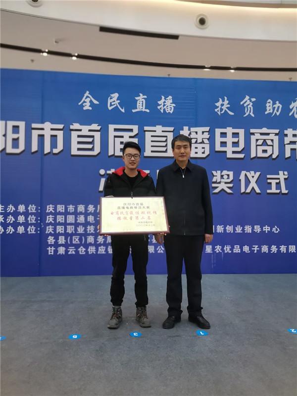 2020年10月,張瑞江和10個校友組建直播團隊,報名參加了慶陽市“全民直播·扶貧助農(nóng)”首屆直播電商帶貨大賽,比賽中他們嶄露頭角,當(dāng)天就收益2.3萬元。在總決賽中,他以出色的剪輯技術(shù)和表現(xiàn)手法脫穎而出,榮獲最佳短視頻播放量第二名。