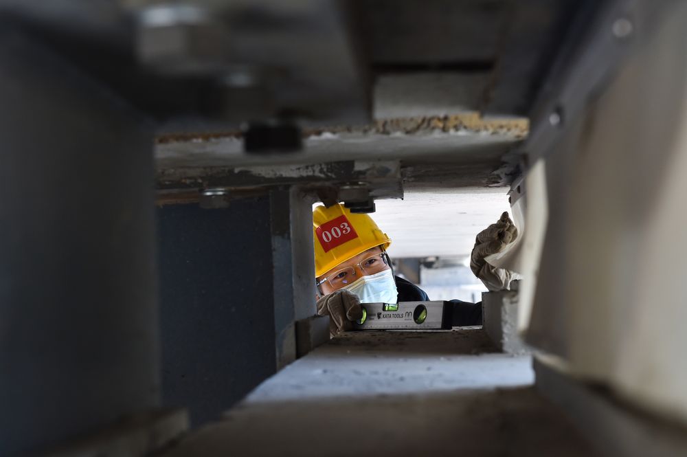 2月9日,在鄭太高鐵太焦段的白北村烏馬河大橋,工人郭永強使用水平儀進(jìn)行檢測。新華社記者 柴婷 攝