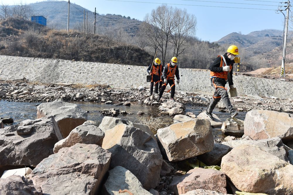 2月9日,在鄭太高鐵太焦段的白北隧道附近,申源(右)和工友通過一條小河前往下一個檢修點。新華社記者柴婷 攝