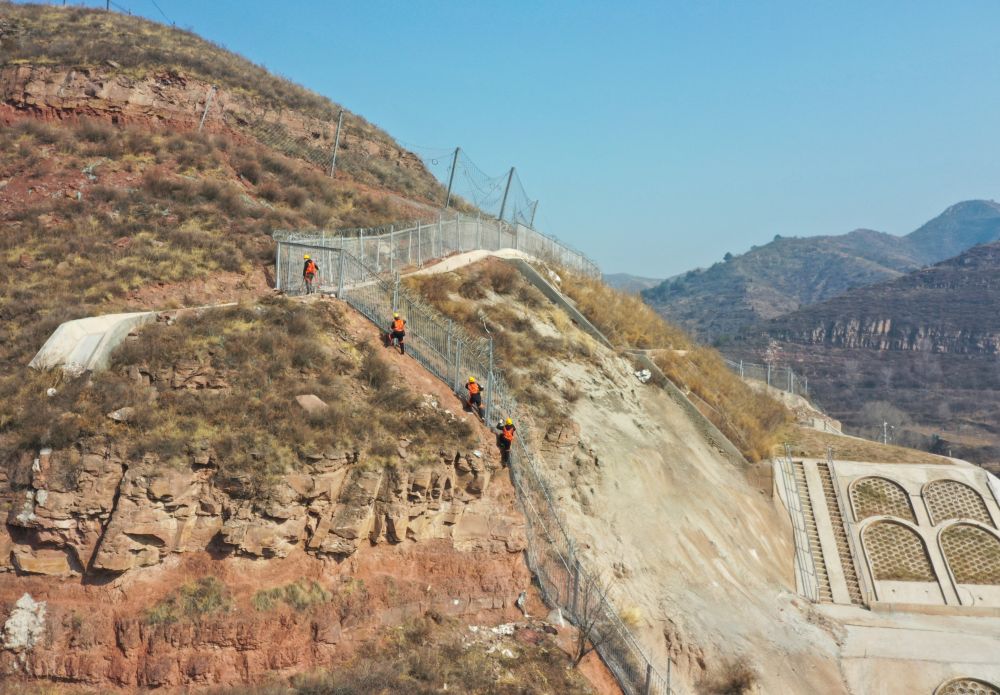 2月9日,在鄭太高鐵太焦段的太谷隧道附近,申源(左一)和工友沿山體攀爬(無人機照片)。新華社記者 柴婷 攝