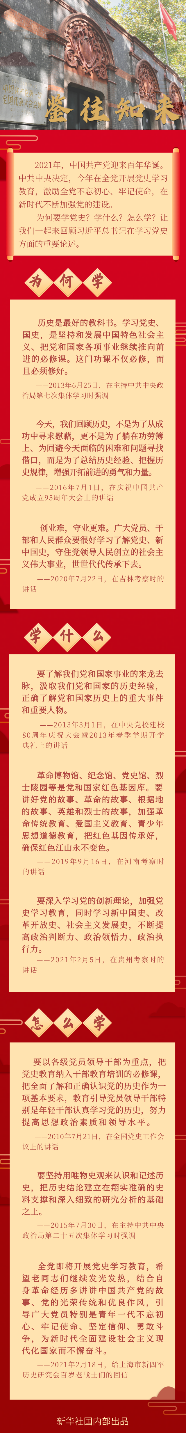 2021年,中國共產(chǎn)黨迎來百年華誕。中共中央決定,今年在全黨開展黨史學(xué)習(xí)教育,激勵(lì)全黨不忘初心、牢記使命,在新時(shí)代不斷加強(qiáng)黨的建設(shè)。為何要學(xué)黨史?學(xué)什么?怎么學(xué)?讓我們一起來回顧習(xí)近平總書記在學(xué)習(xí)黨史方面的重要論述。