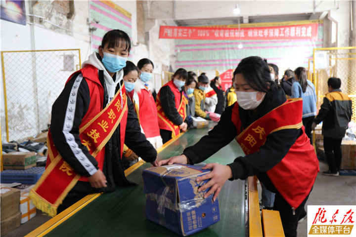 志愿者在慶陽(yáng)韻達(dá)快遞服務(wù)有限責(zé)任公司體驗(yàn)快遞分揀工作。