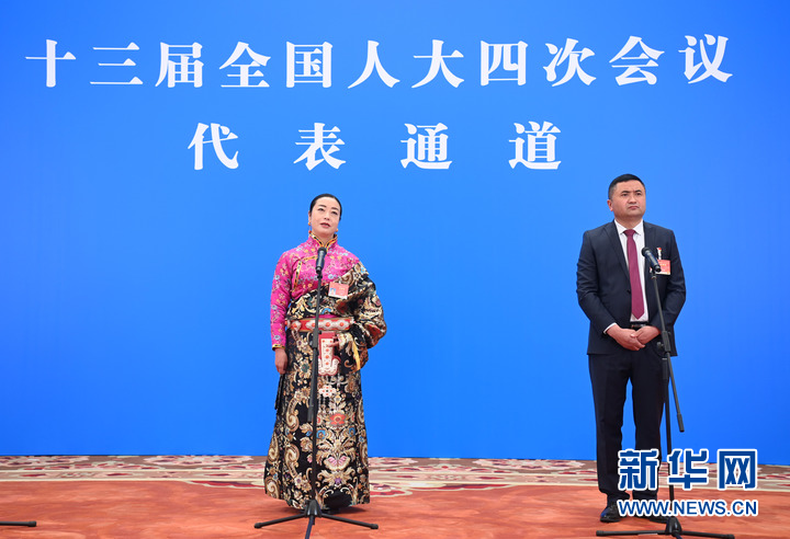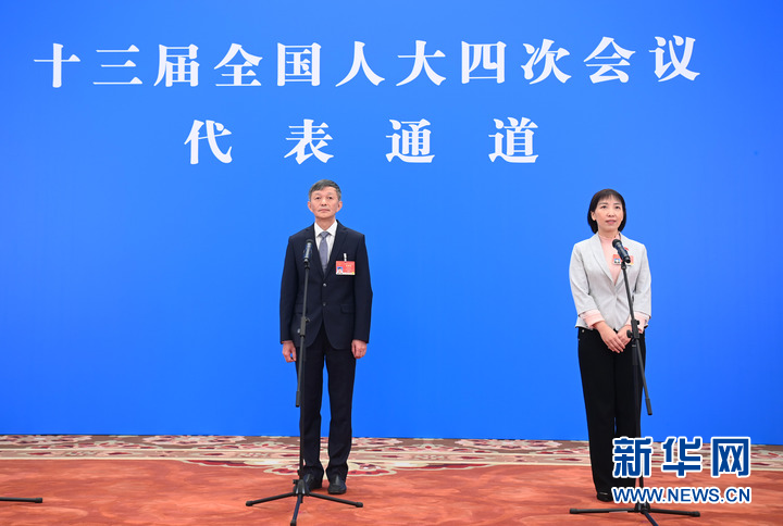 3月5日,第十三屆全國人民代表大會第四次會議舉行首場“代表通道”采訪活動。這是全國人大代表蘇伯民(左)、查艷通過網(wǎng)絡視頻方式接受采訪。新華社記者 金良快 攝