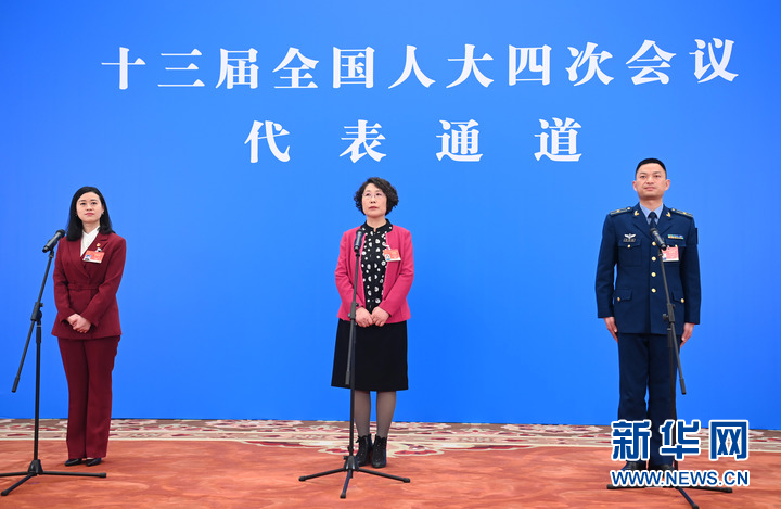 3月5日,第十三屆全國人民代表大會第四次會議舉行首場“代表通道”采訪活動。這是全國人大代表袁晶、郭艷玲、余海龍(從左至右)通過網(wǎng)絡視頻方式接受采訪。新華社記者 金良快 攝
