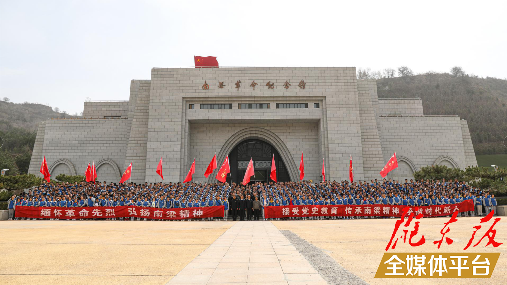 全體師生在南梁革命紀(jì)念館前合影。