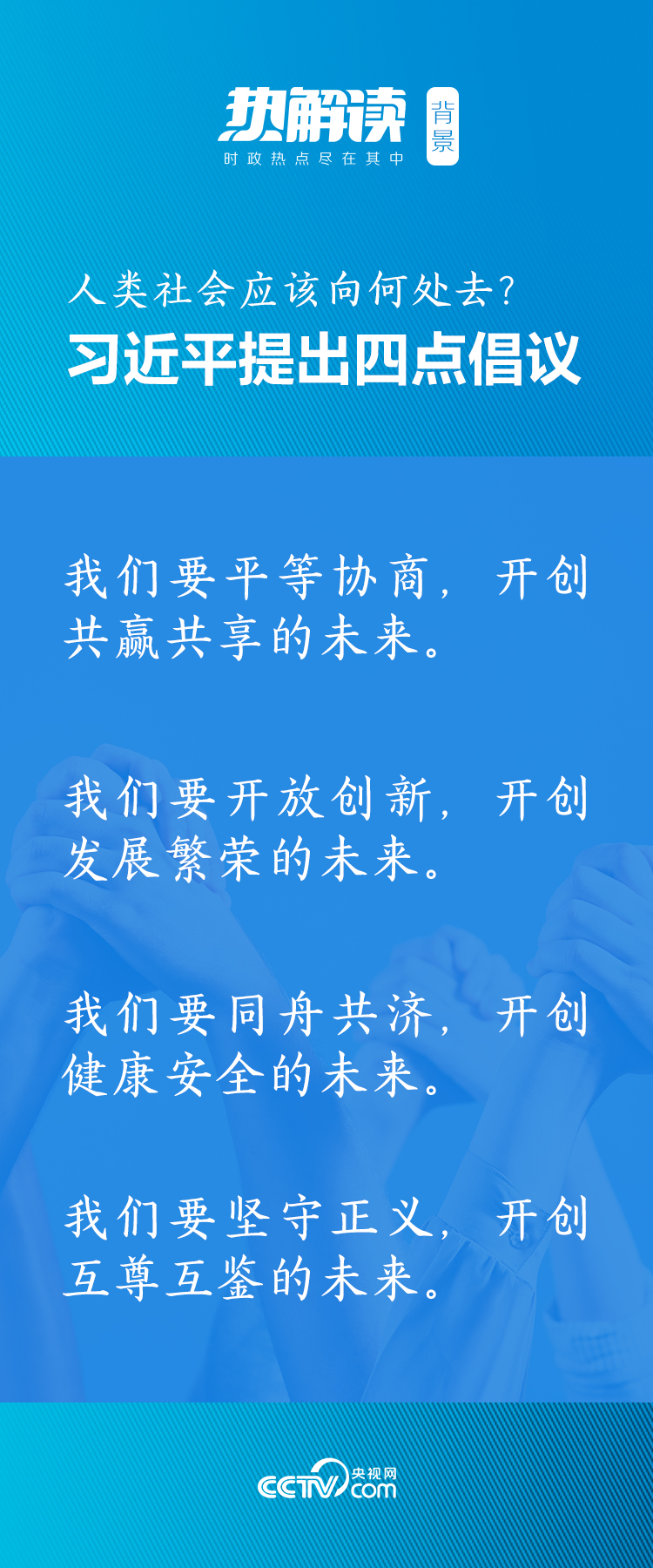 要平等協(xié)商、開(kāi)放創(chuàng)新、同舟共濟(jì)、堅(jiān)守正義,習(xí)主席的“四點(diǎn)倡議”集中體現(xiàn)了共建一個(gè)普遍安全、共同發(fā)展國(guó)際社會(huì)的大國(guó)擔(dān)當(dāng)。