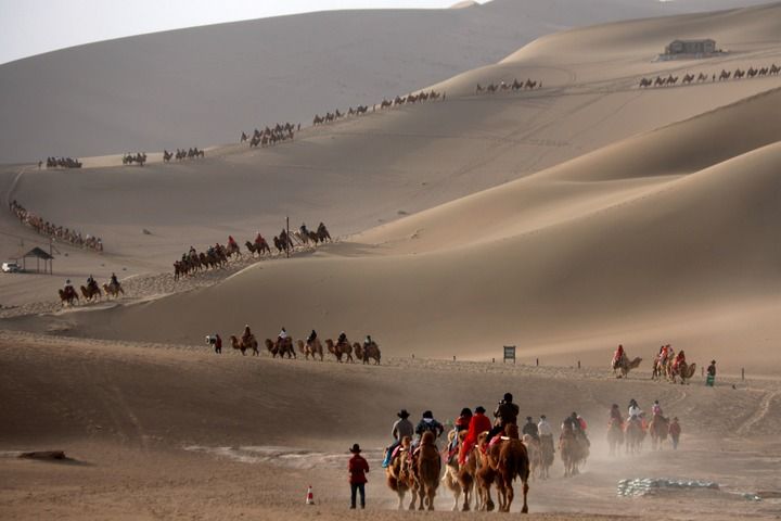 游客在甘肅省敦煌市鳴沙山月牙泉景區(qū)游覽(5月1日攝)。新華社發(fā)(張曉亮 攝)