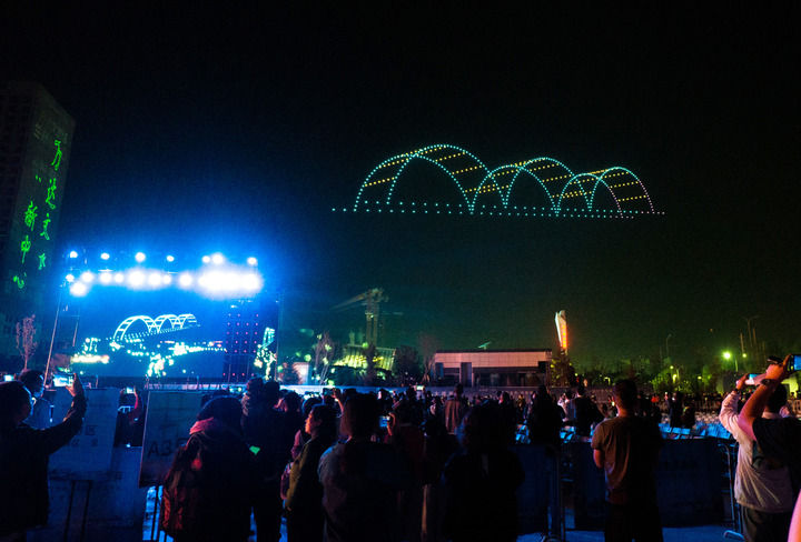 5月5日晚,蘭州市民觀看無人機(jī)編隊(duì)展示的蘭州地標(biāo)中山橋圖案。