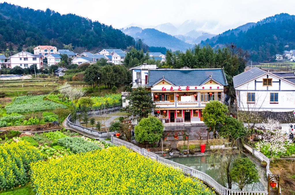 遵義市楓香鎮(zhèn)花茂村村民王治強(qiáng)經(jīng)營(yíng)的“紅色之家”農(nóng)家樂(2020年2月28日攝,無(wú)人機(jī)照片)。新華社記者陶亮攝