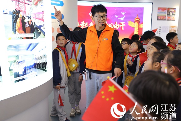 海州灣小學(xué)學(xué)生在連云區(qū)新時代文明實(shí)踐中心參觀主題展館。黃楚鈺攝