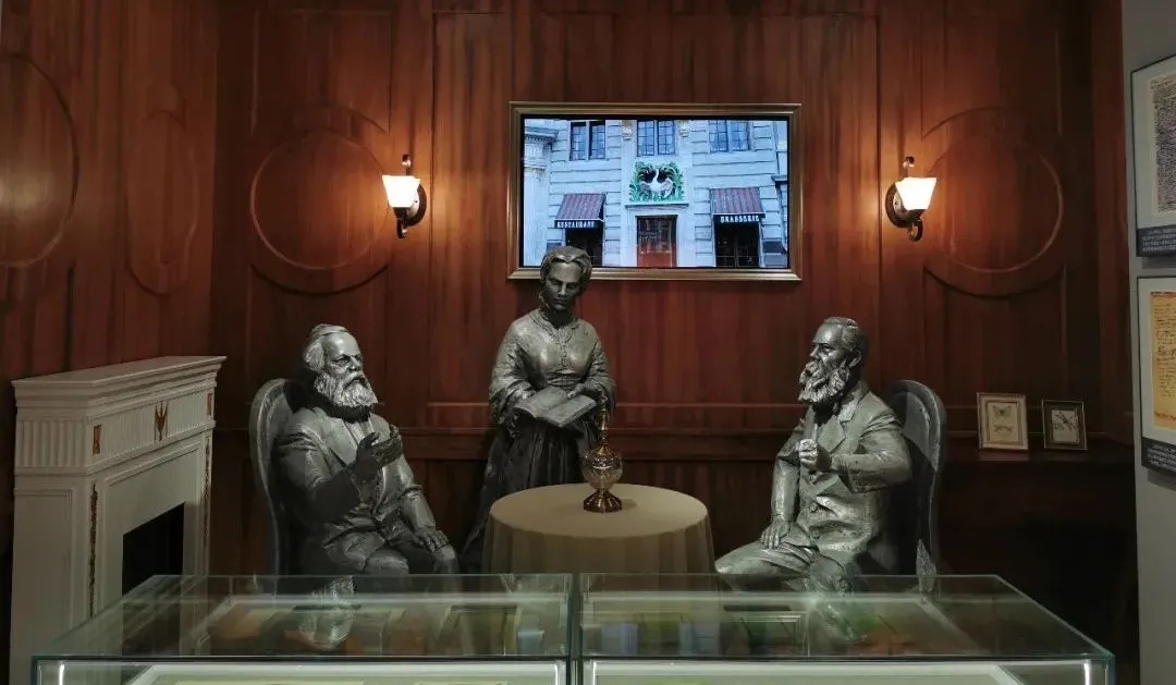 在第二展廳,重點(diǎn)展示了比利時(shí)布魯塞爾白天鵝咖啡館內(nèi),馬克思、恩格斯當(dāng)年結(jié)下深厚友誼、聯(lián)手研究寫作《共產(chǎn)黨宣言》的歷史情境。在這里將特別提及馬克思、恩格斯動(dòng)筆寫《共產(chǎn)黨宣言》時(shí)的年齡,一個(gè)29歲,一個(gè)27歲,突顯這部經(jīng)典是無產(chǎn)階級(jí)政黨的青春宣言、成長宣言,字里行間洋溢著一個(gè)先進(jìn)政黨橫空出世時(shí)的初心使命。