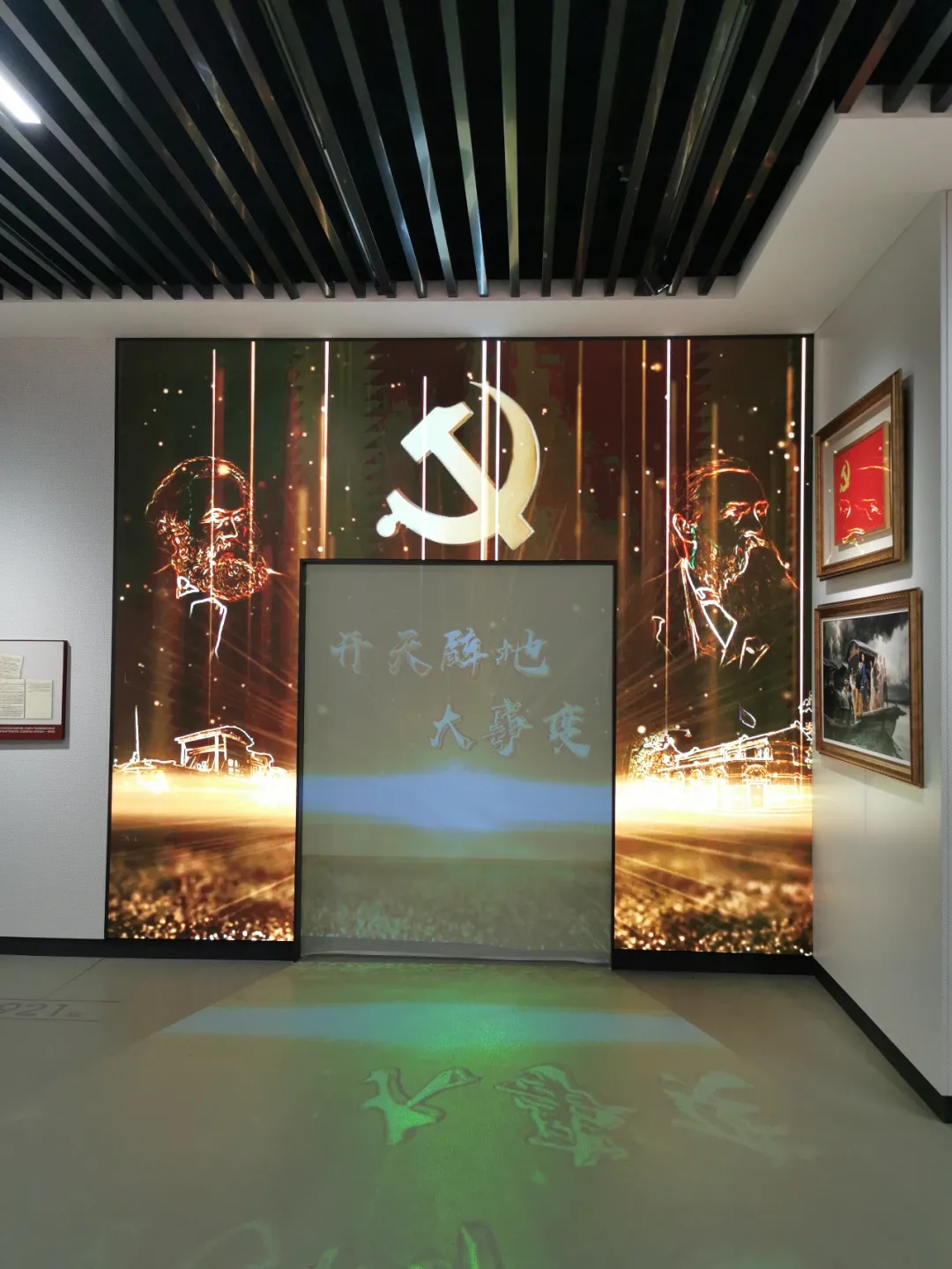 在第四展廳中,通過制作的電影和特效視頻塑造了英勇悲壯的“巴黎公社革命”、驚心動(dòng)魄的“十月革命”,形成全方位的視覺沖擊,讓人仿佛穿越并置身歷史情境。在《共產(chǎn)黨宣言》與中國部分,通過多媒體技術(shù)和油畫作品,展示“中共一大”召開的場景,介紹從上海石庫門到南湖紅船這一開天辟地大事變的過程和意義,突出藝術(shù)與情境的浸潤。