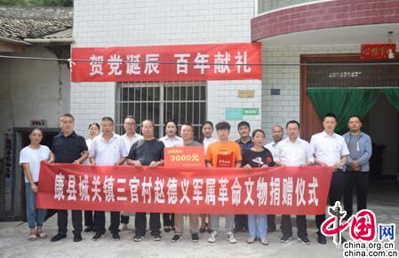 在中國共產(chǎn)黨誕辰100周年來臨之際,6月30日,隴南市康縣隴南根據(jù)地紀(jì)念館館長茍長途帶領(lǐng)工作人員一行3人赴城關(guān)鎮(zhèn)三官村革命功臣趙德義親屬家中舉行革命文物捐贈儀式。縣委黨史研究室主任鄧文德、城關(guān)鎮(zhèn)主要領(lǐng)導(dǎo)及博物館相關(guān)工作人員參加了儀式。