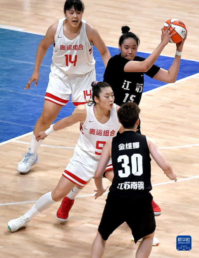 9月14日,江蘇隊(duì)球員許晨妍(右)和聯(lián)合隊(duì)球員潘臻琦在比賽中爭搶籃板球。