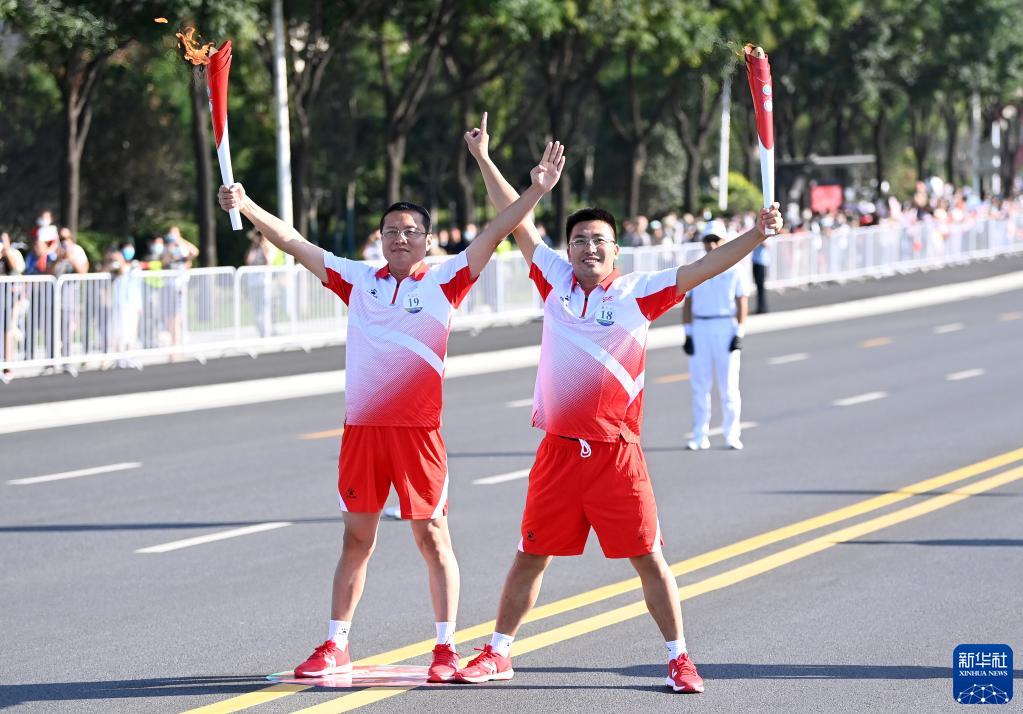 9月12日,火炬手柏華(左)和劉洋在火炬?zhèn)鬟f中。新華社記者劉瀟攝