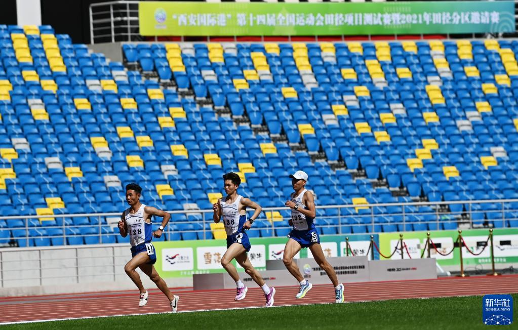 4月28日,在陜西西安舉行的第十四屆全國運動會田徑項目測試賽暨2021年田徑分區(qū)邀請賽(西北賽區(qū))男子組10000米決賽中,青海隊選手仁青東知布(左)以30分21秒44的成績獲得季軍。新華社記者李一博攝
