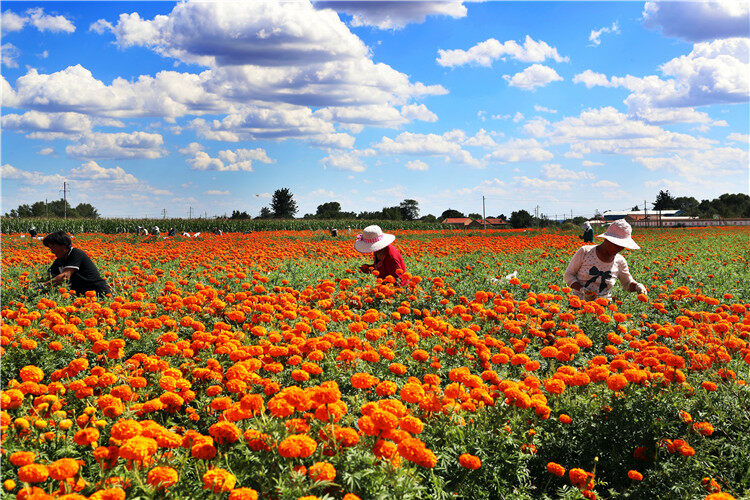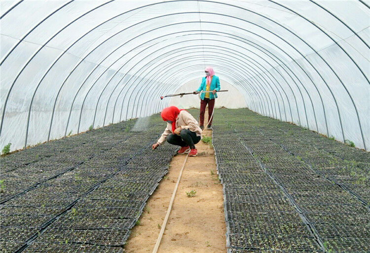 2020年4月27日,工人們正在環(huán)縣八珠鄉(xiāng)八珠塬村的60座規(guī)?;羞B片示范棚內(nèi)檢查萬壽菊幼苗長勢,進(jìn)行拔草、灑水作業(yè)。