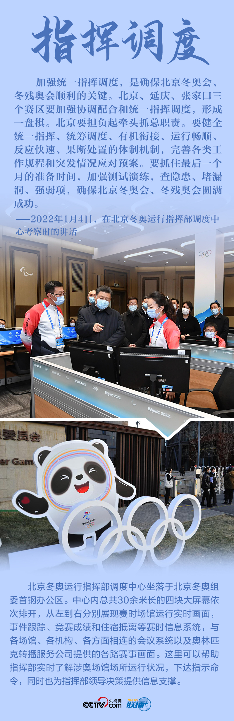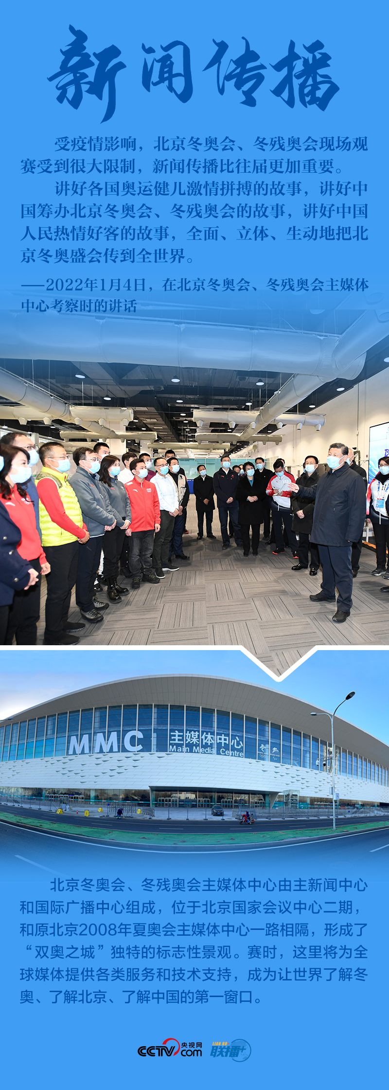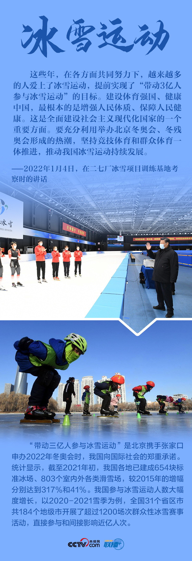 聯(lián)播+“今天是元旦后上班第一天,我來專題調(diào)研北京冬奧會(huì)、冬殘奧會(huì)籌備工作,主要是來給大家鼓勁加油?!?月4日,北京冬奧會(huì)開幕倒計(jì)時(shí)一個(gè)月之際,習(xí)近平總書記在北京深入體育場(chǎng)館、媒體中心、訓(xùn)練基地等,實(shí)地了解2022年冬奧會(huì)、冬殘奧會(huì)籌辦備賽情況。
