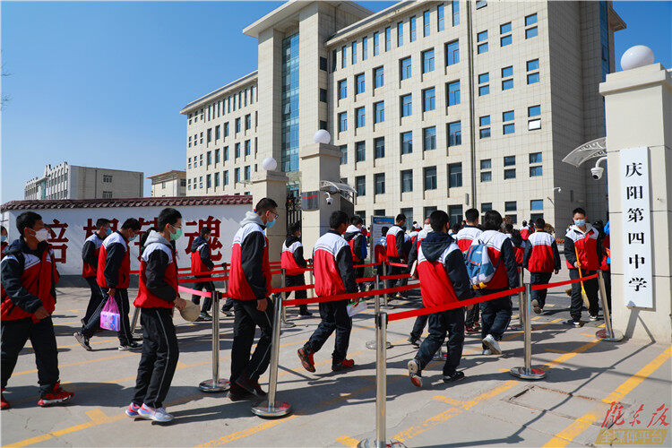 ↑慶陽第四中學(xué)的學(xué)生有序步入校園。