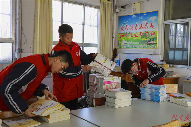↑慶陽第三中的學(xué)生正在分發(fā)新學(xué)期教材。