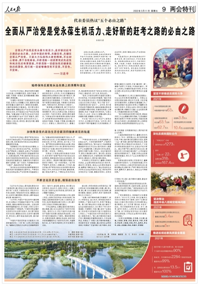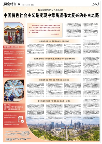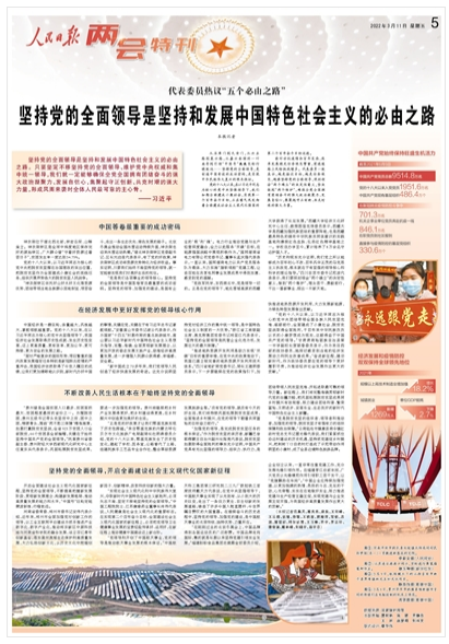 3月5日,習(xí)近平總書記在參加十三屆全國人大五次會(huì)議內(nèi)蒙古代表團(tuán)的審議時(shí),回顧新時(shí)代黨和人民奮進(jìn)歷程,鮮明提出“五個(gè)必由之路”重大論斷,引發(fā)代表委員熱議。人民日?qǐng)?bào)兩會(huì)特刊今日以五個(gè)整版的篇幅刊發(fā)《代表委員熱議“五個(gè)必由之路”》,聚焦“堅(jiān)持黨的全面領(lǐng)導(dǎo)是堅(jiān)持和發(fā)展中國特色社會(huì)主義的必由之路”“中國特色社會(huì)主義是實(shí)現(xiàn)中華民族偉大復(fù)興的必由之路”“團(tuán)結(jié)奮斗是中國人民創(chuàng)造歷史偉業(yè)的必由之路”“貫徹新發(fā)展理念是新時(shí)代我國發(fā)展壯大的必由之路”“全面從嚴(yán)治黨是黨永葆生機(jī)活力、走好新的趕考之路的必由之路”。