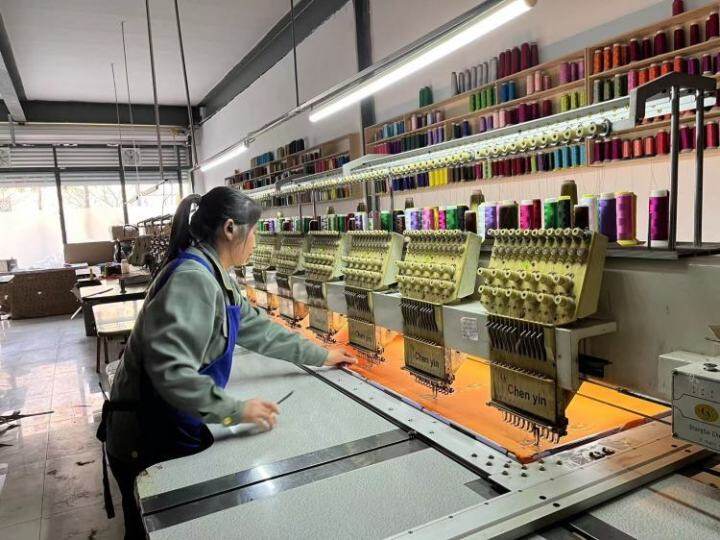 慶陽凌云服飾集團有限公司刺繡車間,女工在制作蘭州大學(xué)訂制的老虎香包。