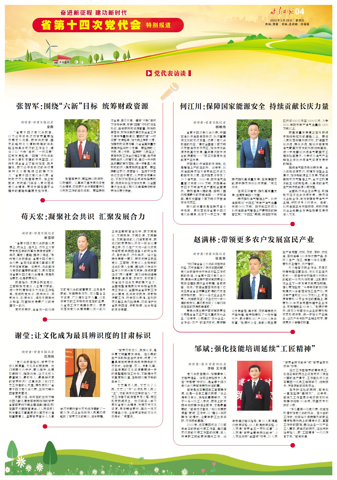 “省第十四次黨代會(huì)報(bào)告,以習(xí)近平總書(shū)記對(duì)甘肅重要指示要求為統(tǒng)攬,把中央政策、國(guó)家戰(zhàn)略轉(zhuǎn)化為清晰明確的實(shí)踐路徑和具體可行的工作任務(wù),描繪了以‘六新’目標(biāo)、‘一核三帶’區(qū)域發(fā)展格局、‘四強(qiáng)’行動(dòng)實(shí)踐抓手為牽引支撐的宏偉藍(lán)圖,必將引領(lǐng)全省上下自我加壓、跳身摘桃,把習(xí)近平總書(shū)記的關(guān)懷厚愛(ài)轉(zhuǎn)化為趕超進(jìn)位的強(qiáng)大動(dòng)力。”省第十四次黨代會(huì)代表、省財(cái)政廳廳長(zhǎng)張智軍表示,站上新起點(diǎn),財(cái)政部門將深入貫徹落實(shí)黨代會(huì)精神,更好發(fā)揮在國(guó)家治理中的基礎(chǔ)和重要支柱作用。